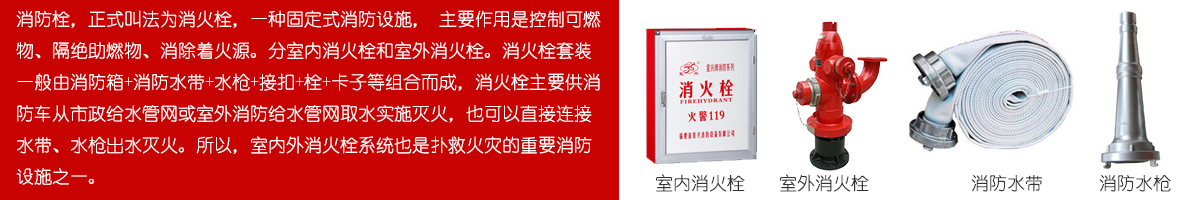 室內(nèi)消防栓、室外消火栓、旋轉(zhuǎn)消火栓、地下消防栓、地上消防栓、雙口雙閥消火栓、室外直埋伸縮式消火栓等;