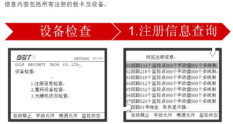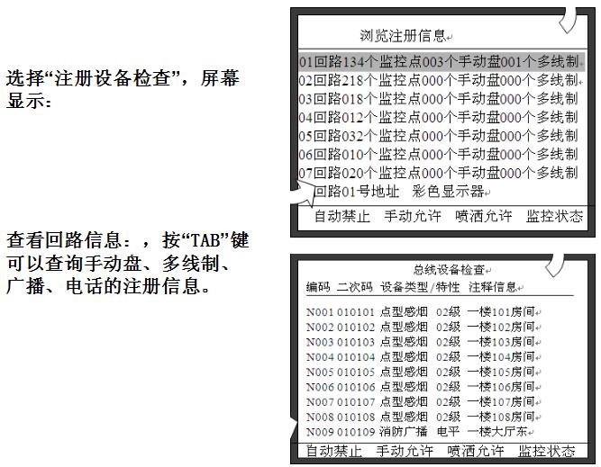選中某一回路,按下“確認(rèn)”鍵,將顯示這一回路注冊到的各設(shè)備的信息,-上一行的設(shè)備高亮顯示;按任意數(shù)字鍵高亮消失,控制器處于總線設(shè)備檢查狀態(tài)