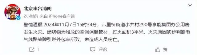 11月7日晚,北京市豐臺區(qū)消防支隊發(fā)布警情通報,2024年11月7日15時34分,六里橋街道小井村290號京能集團辦公用房發(fā)生火災(zāi)。燃燒物為堆放的空調(diào)保溫管材,過火面積3平米。火災(zāi)原因初步判斷電氣線路故障引燃外包裝所致,未造成人員傷亡。