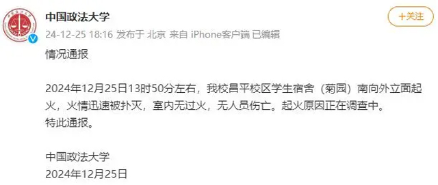12月25日下午,網(wǎng)傳中國政法大學昌平校區(qū)突發(fā)火災,現(xiàn)場濃煙滾滾。據(jù)中國政法大學官方微博發(fā)布的情況通報,2024年12月25日13時50分左右,昌平校區(qū)學生宿舍(菊園)南向外立面起火,火情迅速被撲滅,無人員傷亡。